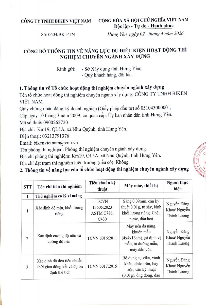 Liên Hệ Hotline: Tp Đấu Thầu và QLDA: 0965 839 836.Công ty TNHH Biken Việt Nam là Công ty có vốn đầu tư của Nhật Bản tại Văn Lâm - Hưng Yên, chuyên sản xuất các sản...